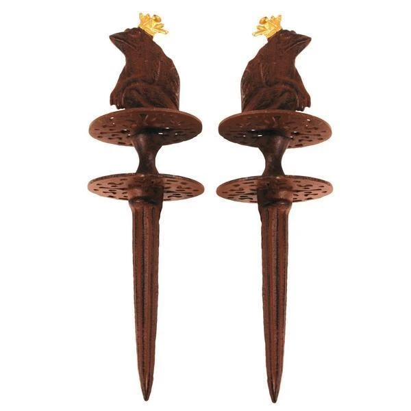 Antiekbruine gietijzeren tuinslanggeleider met decoratieve kikkerkoning op top. Met de hulp van deze decoratieve tuinslanggeleider trek je de tuinslang bij het gieten niet meer doorheen de plantenborders, maar glijden ze netjes langs de geleider en volgen ze de opgegeven route.