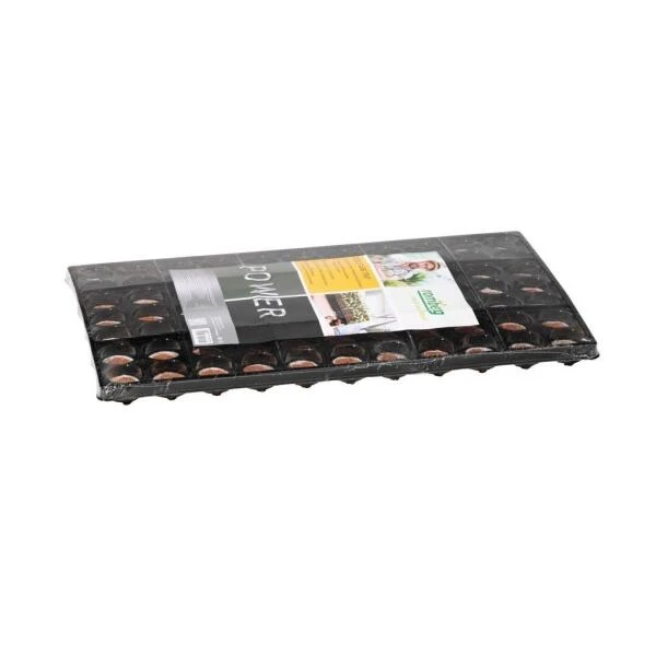 Opkweekplaat met 77 schijfjes of tabletten gemaakt van samengeperste kokosvezels. Door eenvoudig water toe te voegen zullen de schijfjes binnen de tien minuten opzwellen tot handige kweekpotjes voor het zaaien en verspenen.