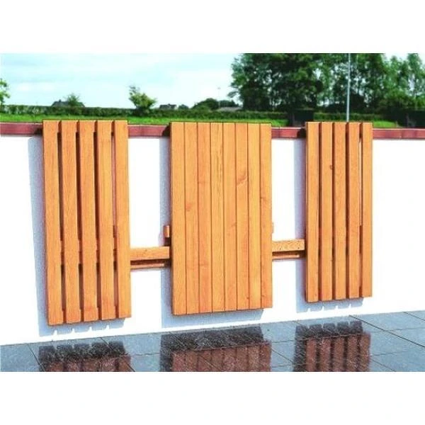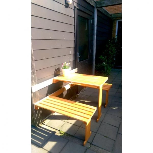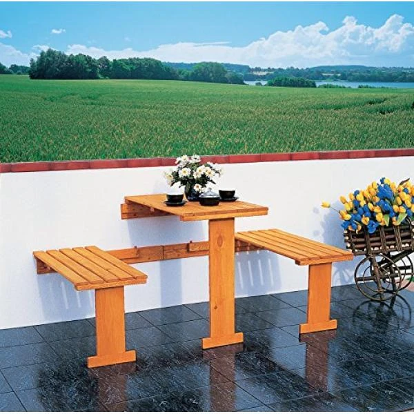 Houten opvouwbare balkonset (tafel met twee bankjes). Zeer handig tafeltje met bijpassende bankjes voor een balkon of terras met beperkte ruimte. Na het gebruik van deze balkonset kan u de tafel en de bankjes gewoonweg tegen de muur opvouwen.