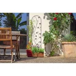 Klimplantensteun uit metaal afgewerkt met een plantenmotief. Helpt planten te ondersteunen maar kan ook louter decoratief gebruikt worden in de tuin.